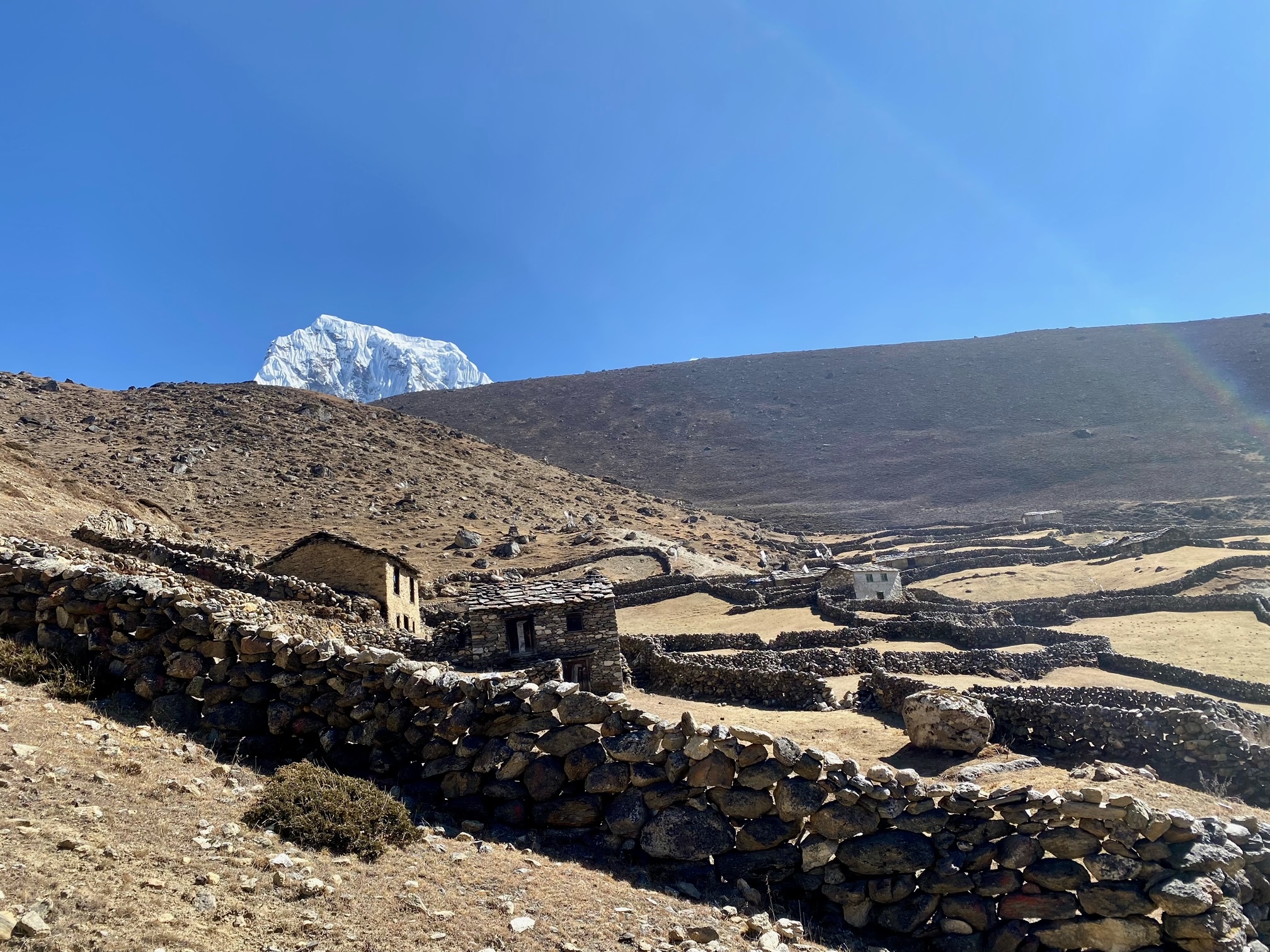 The day I hiked from base camp to a nearby village to transmit my last blog post was also very centering. I walked up a long valley beside a glacial moraine, through grassy meadows surrounded by towering peaks, enjoying the simple rhythm of walking through beauty. During the five hour round trip, my only encounter on the trail was with a yak herder and his yaks, their bells jingling. On the return trip, the upper portion of Cholatse was constantly in front of me, rising above the hills and meadows. Despite my worries, I was glad I was headed there. Here is a photo I took as I walked past some yak enclosures.