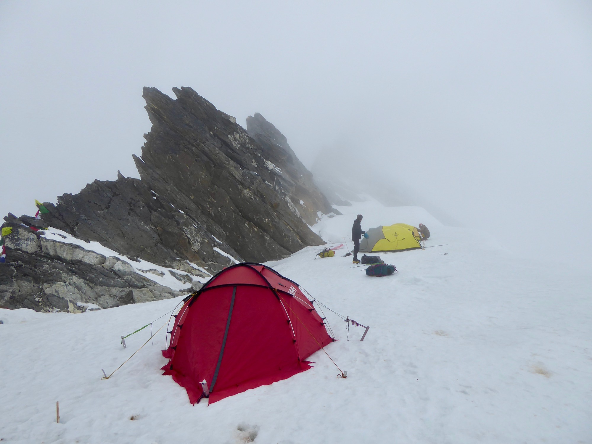 The morning of the 11th, we methodically filled our packs, triple checked that we had every item on our checklist, and prepared to head to Camp One. As we left base camp, the Sherpas burned juniper at the alter which had been blessed by a local lama when we first arrived at the mountain. As is his custom, Phil let each of us move to Camp One whenever we wanted, free to move in company or alone as we preferred. I climbed alone, and felt great every step of the way. Physically, my body had adjusted to the altitude and I felt strong. Mentally, something had clicked to make me feel confident and ready. Half way up the steep headwall from the glacier to the saddle where Camp One is located, I clipped into an anchor point on the fixed line, paused, looked around, and felt an unexpected wave of pure contentment. By the time I pulled myself over the top of the headwall, the usual afternoon clouds had closed in on Camp One, but it still felt good to be there. Here is a photo I took as I arrived.