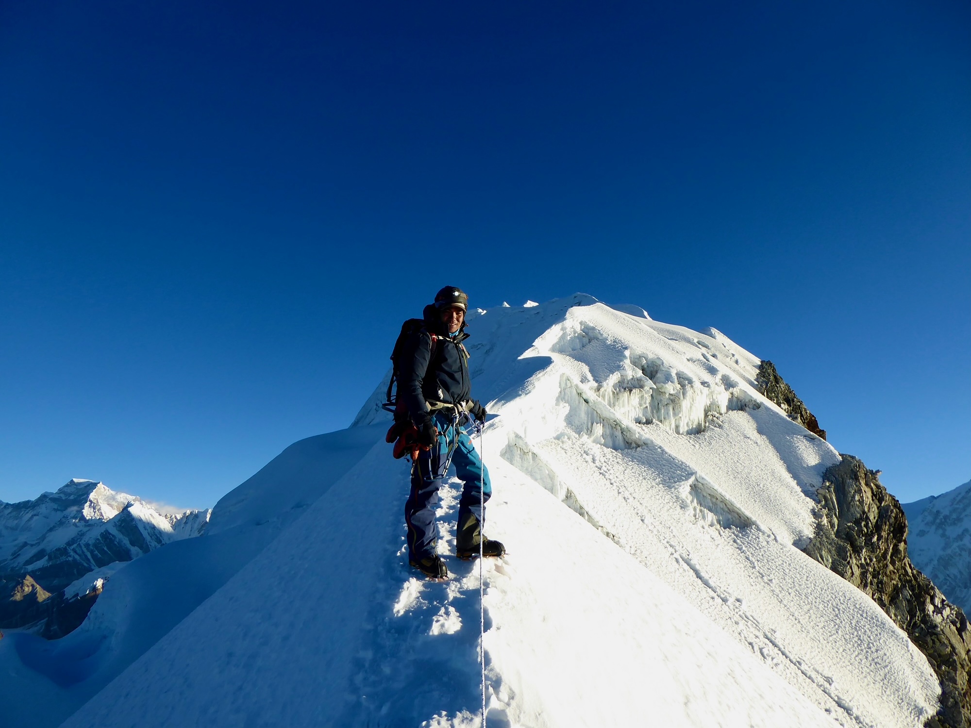 Four hours into the climb, it began to grow light on the horizon. I was dimly aware of surrounding summits being illuminated in the pre-dawn light, and dimly aware of the beauty of the moment. The ridge flattened briefly and I asked Sonam: “Is this Camp Two?”. “Camp Two already below us”, he responded. I had missed it in the dark. We climbed higher, and reached the point where the angle of the ridge eases. It was now fully light and we switched off our headlamps. I knew from here it should be a few more hours to the summit, on far more gentle terrain, and I began to think I might make it. I dug my camera out of my down jacket and took this picture of Sonam.