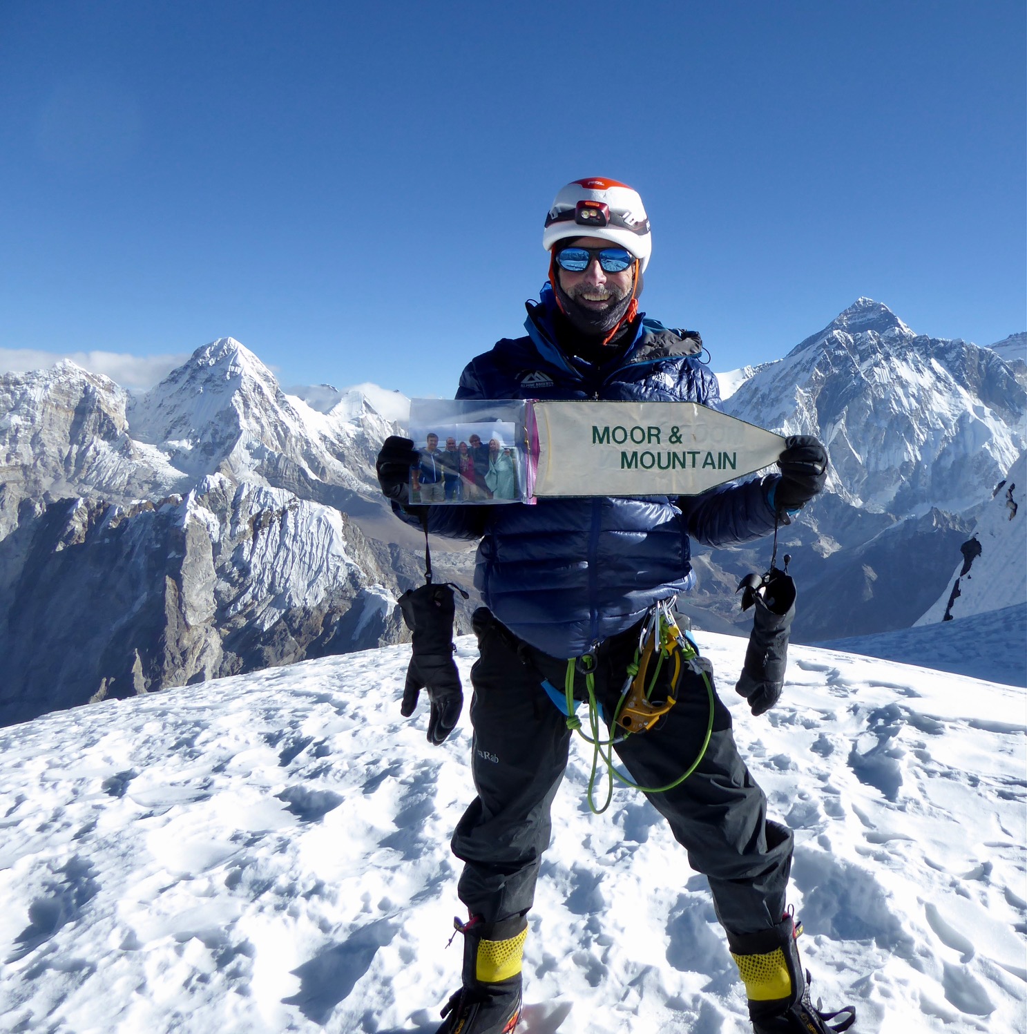 Meanwhile, Sonam checked in with Phil and the other Sherpas on the radio. “Lenny and Dan turn around”, he informed me, “now just you.” We continued. In the distance, we could see Phil climbing a steep ramp to what looked like the summit. It was further away than I wanted it to be. We continued. Some time later, Phil passed us on his way down, having reached the summit. I guessed it was maybe thirty minutes away. “You are doing great”, he encouraged us, “only an hour to go.” So much for thirty minutes. We continued. We climbed the steep ramp I had seen Phil on and I knew we were close. Then we reached a level section, the so-called “false summit’ which many people define as close enough to the actual top. “You want go to true summit?”, Sonam asked. I responded: “You think I can do it?”. He nodded yes. Getting there involved surmounting a thirty foot vertical wall of ice, but that was relatively straightforward given the fixed line and solid ice to kick our crampons into. Then all that was left was a short, gentle climb to a broad, snow covered apex. At 8:30 am, we were on top of Cholatse, in bright sunshine and no wind, with stupendous views in every direction. I saw Gokyo, from where I had viewed Cholatse on my approach trek. Here is a photo Sonam took with my camera. Loyal readers of this blog will know that I have carried the same banner to the top of multiple peaks. Everest was one of them. You can see it’s summit pyramid behind me in the upper right corner.