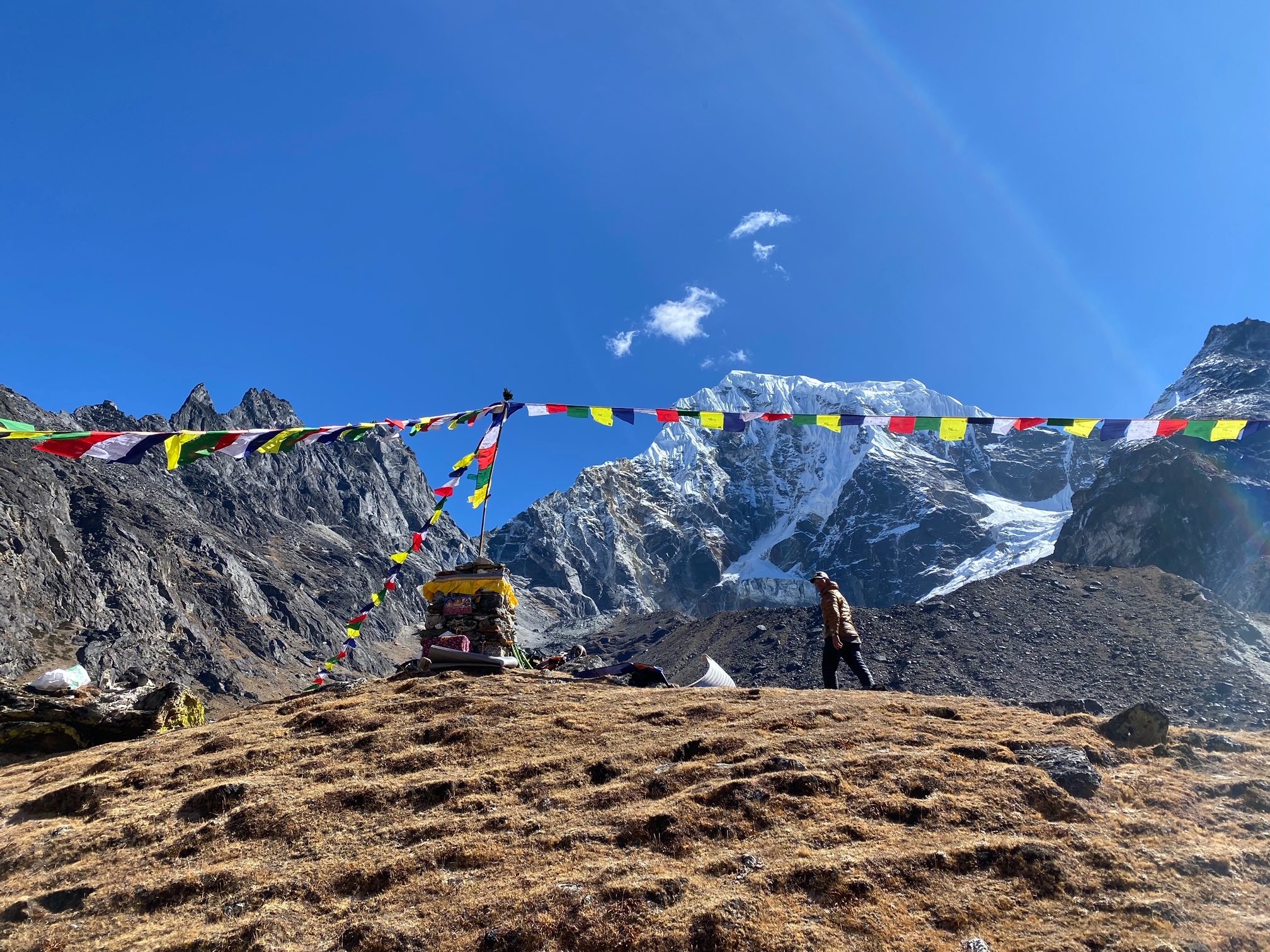 I woke up the next morning to this view: Cholatse viewed through the prayer flags of our base camp alter.