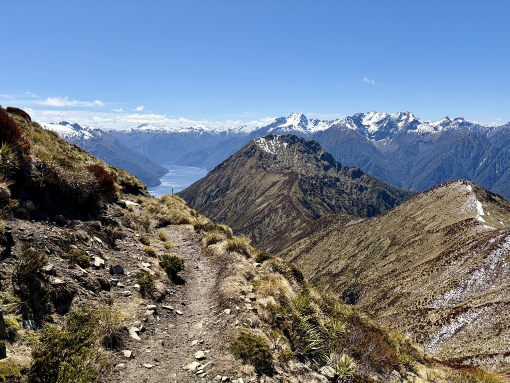 The trail beyond Luxmore Hut ascends steadily into the alpine zone, then follows a series of narrow ridges with jaw dropping views on all sides. As the other people who were hiking this section today had departed first thing in the morning, I was alone up there. This is what it looked like:
