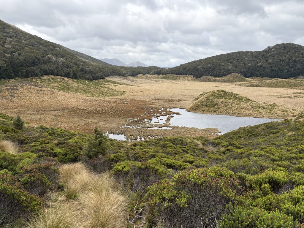 After a second bog crossing, the trail re-entered woods, climbed steeply up to a saddle, then dropped down to a high, open basin with a beautiful lake in the middle of it. Green Lake! From here, it should have been a twenty minute walk along the lake’s edge to Green Lake Hut, but high water had caused the lake to overflow into a wide expanse of tussocks and gorse, making the lake edge impassable. I spent an hour bashing my way through the tussocks, many of them over my head. Stopping frequently to catch my breath, I was grateful for my trekking poles, which also were instrumental in helping me cross deep, water-filled ravines. It was hard work.