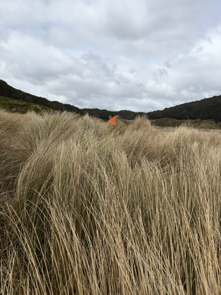 The route went straight across the bog. There was no trail, but the direction was designated by occasional orange markers on posts. The problem was finding the markers amid chest high grass tussocks, especially as I am red-green color blind. Here is a photo of an orange marker rising just above a tussock: