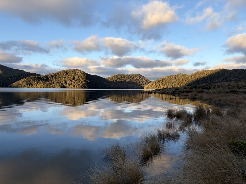 This morning, I hiked back out to the access road. After leaving the hut and navigating the tussock jungle one final time, I arrived at the spot where the trail enters the woods. I turned and looked back at the lake. Over the past three days I had been, as the expression goes, “in a good place,” in all senses. I will hold onto it for a long while.