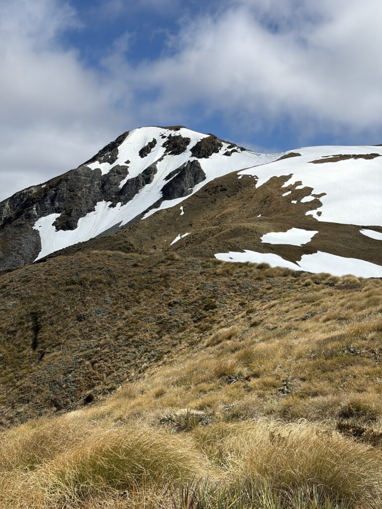 Not knowing how long it would take, I left right after breakfast. The first couple of hours were tough tussock slogging. No trail or signposts here, just feeling my way upward, trying to figure out which ridge I should try to follow to the summit. If I were in Alaska, I would have been worried about bears, but I wasn’t, and happily there are no bears in New Zealand. About halfway up, the tussocks gave way to steep ridges and couloirs filled with moss and loose rock. A few spots were definite “no fall zones,” but they were manageable. When I arrived on top of the main shoulder leading to the summit, I could see I had some snow-covered ridges left to deal with: