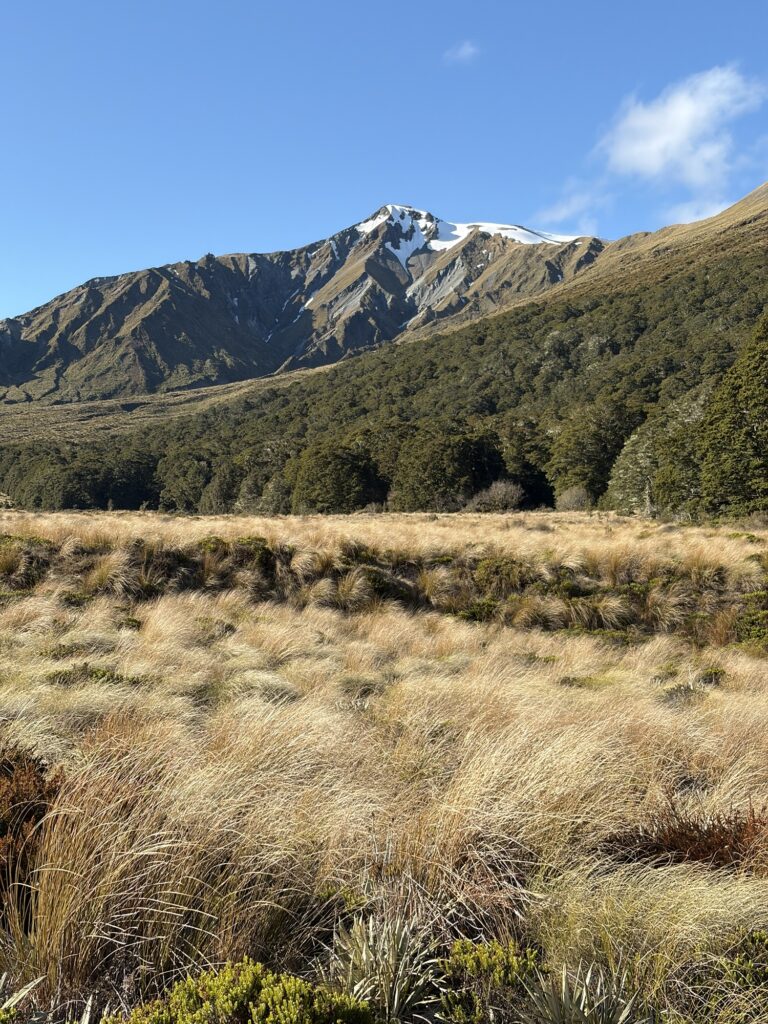 Another challenge was unseen drops amid tussocks into water-filled streams. After resigning myself to wet feet, it all went fine. There was a real beauty to it, especially with snow-covered mountains looming above amid swirling clouds.